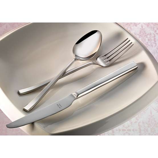 Malzeme : Çatal, kaşık, bıçak ve servis setleri tüm dünyada mutfak sektöründe tercih edilen 1. kalite paslanmaz çelikten imal edilmiştir. Bu çelik AISI 304 standartlarında, içinde %18 Cr, %10 Ni barındırır. Korozyona dayanımı çok yüksek olan malzeme ( kaplama yapılmadan ) özel polisaj işlemi ile ayna parlaklığında yüzeyler sağlar. Bıçaklarımız ise AISI 420 kalite bıçaklık paslanmaz çelikten monoblok olarak üretilmiştir.